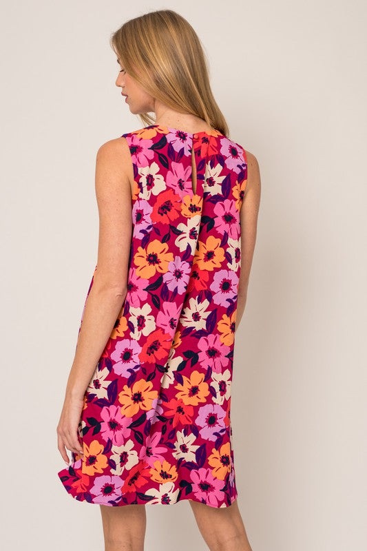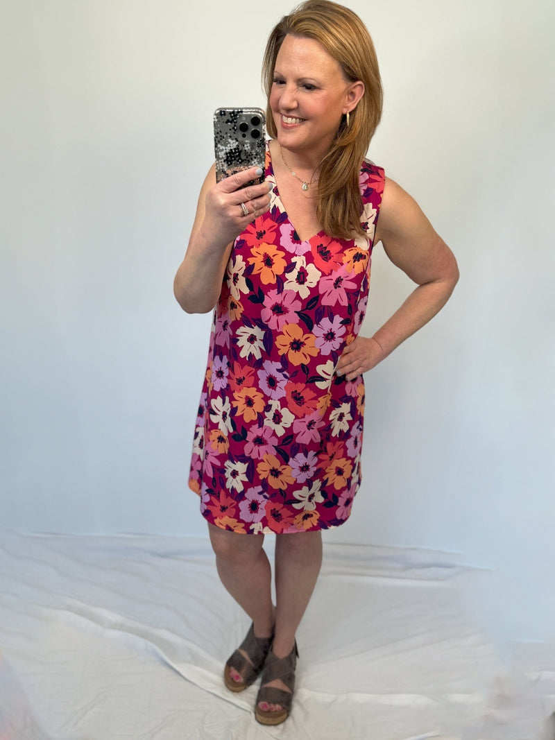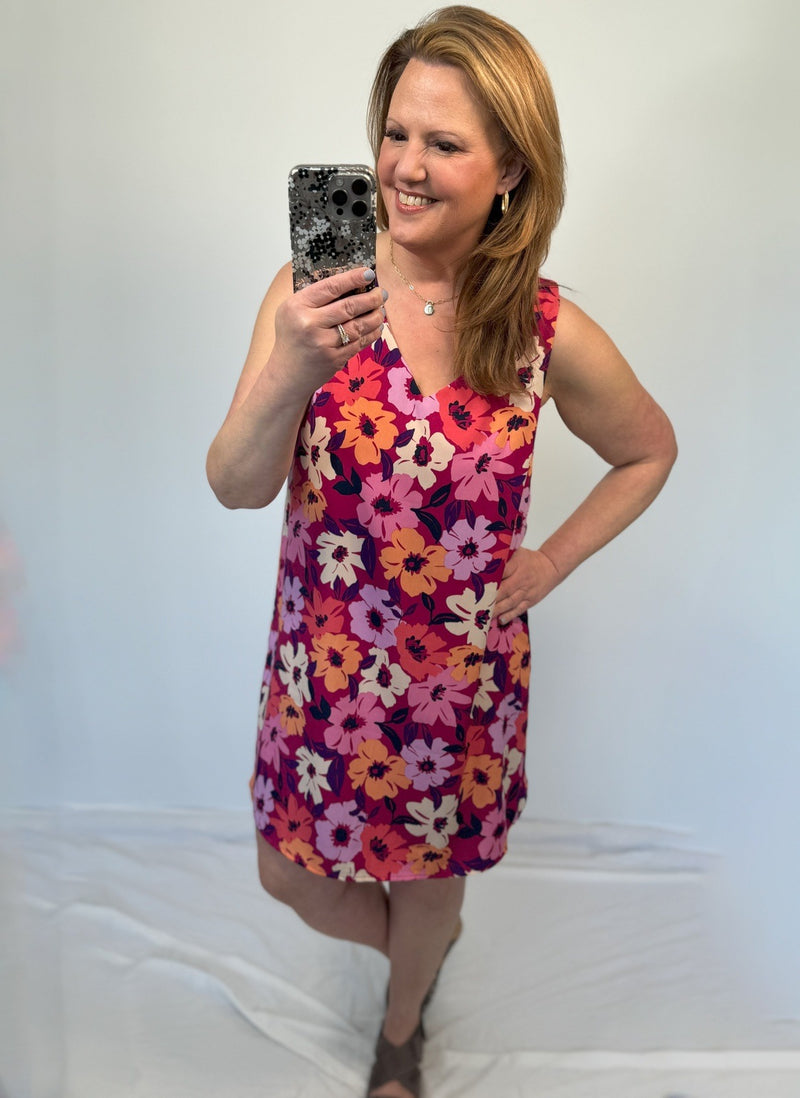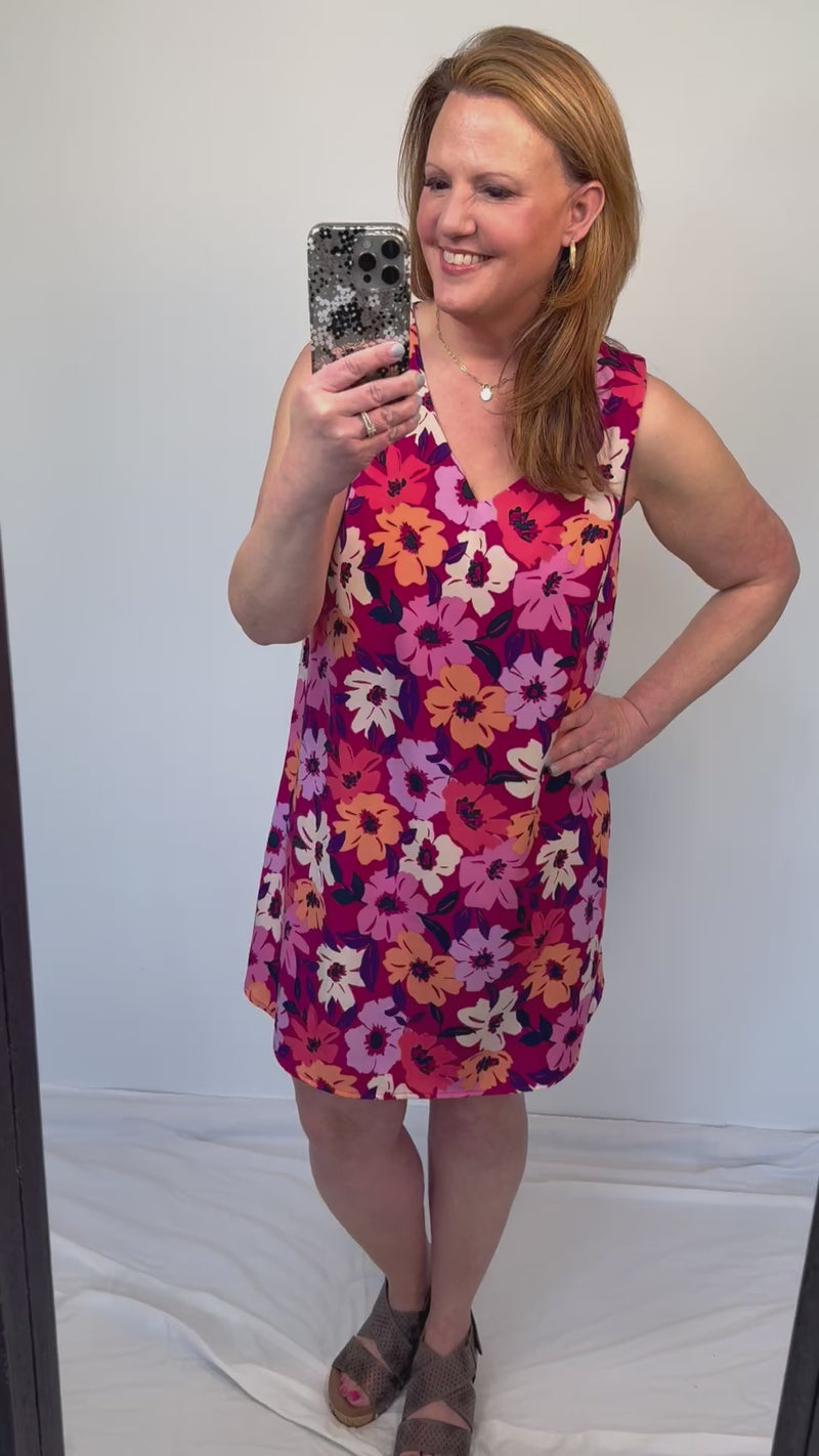 Go bold with our Shay in Magenta Floral dress! This playful, sleeveless v-neck dress features a vibrant floral print that's sure to turn heads. The lightweight fabric and flattering cut make it perfect for any occasion. (Warning: may cause excessive twirling.)