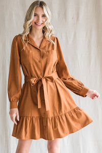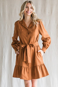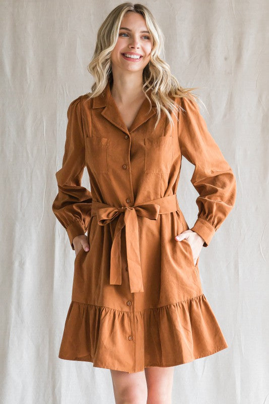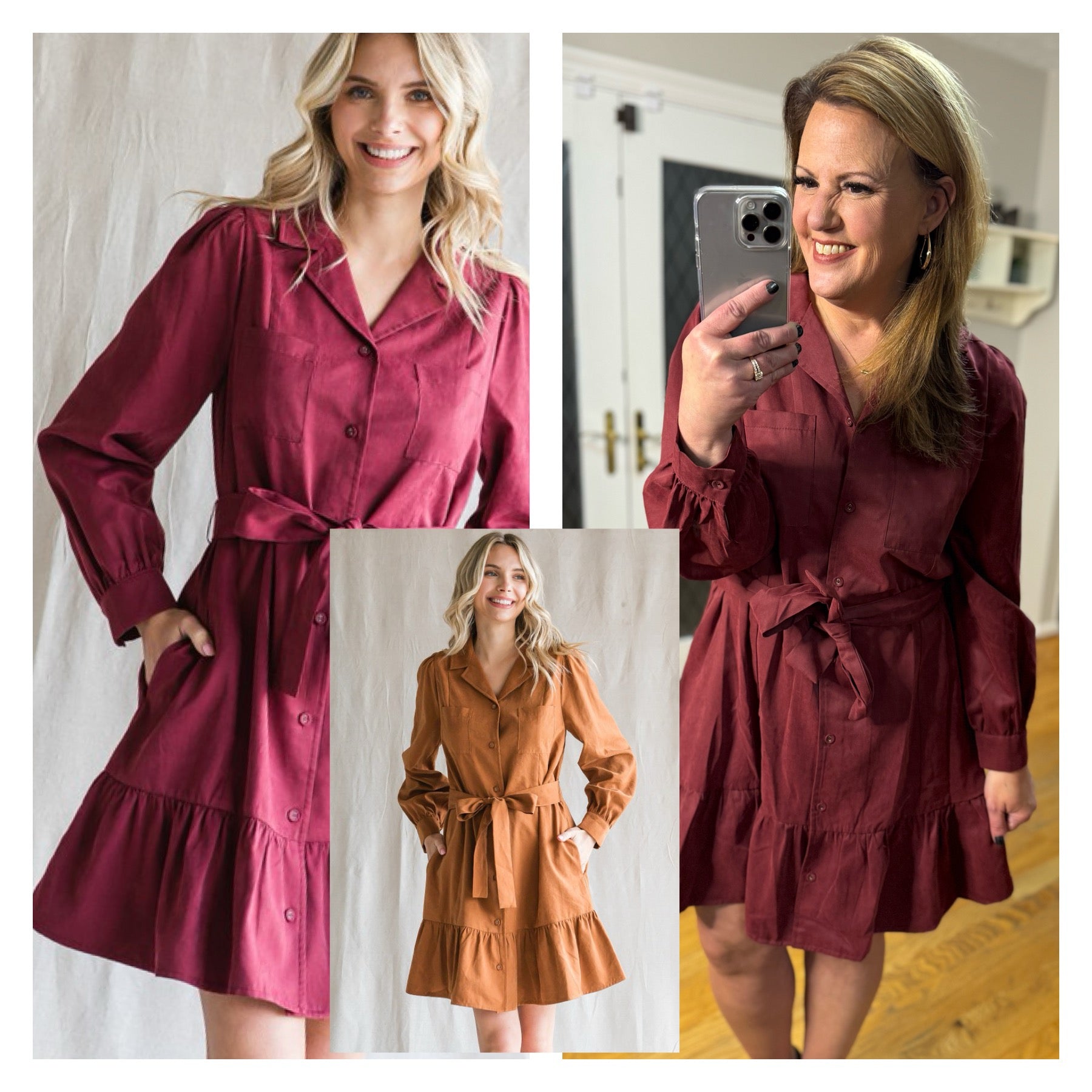 Chantale is a faux suede dress with a notch collared neck, belted waistline, side pockets, long puffed sleeves, buttoned cuffs, and ruffled hemline. Swoon! She’s easy to wear and has a roomy fit. She’s great for those who are blessed in the chest!