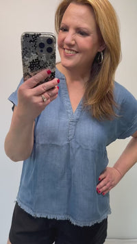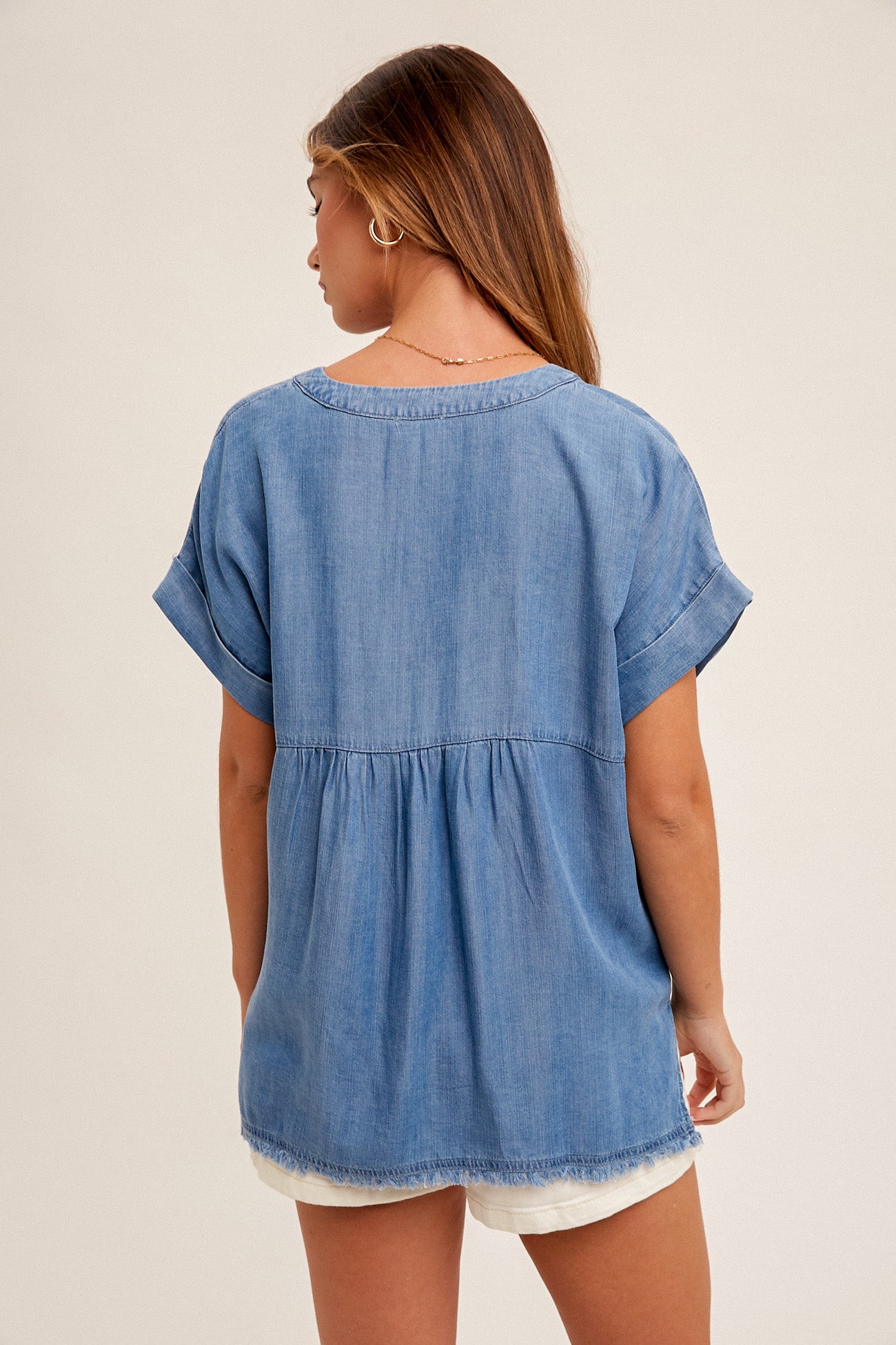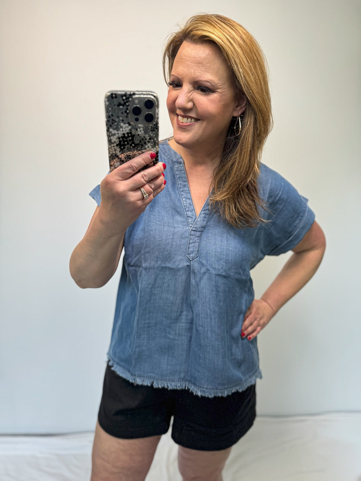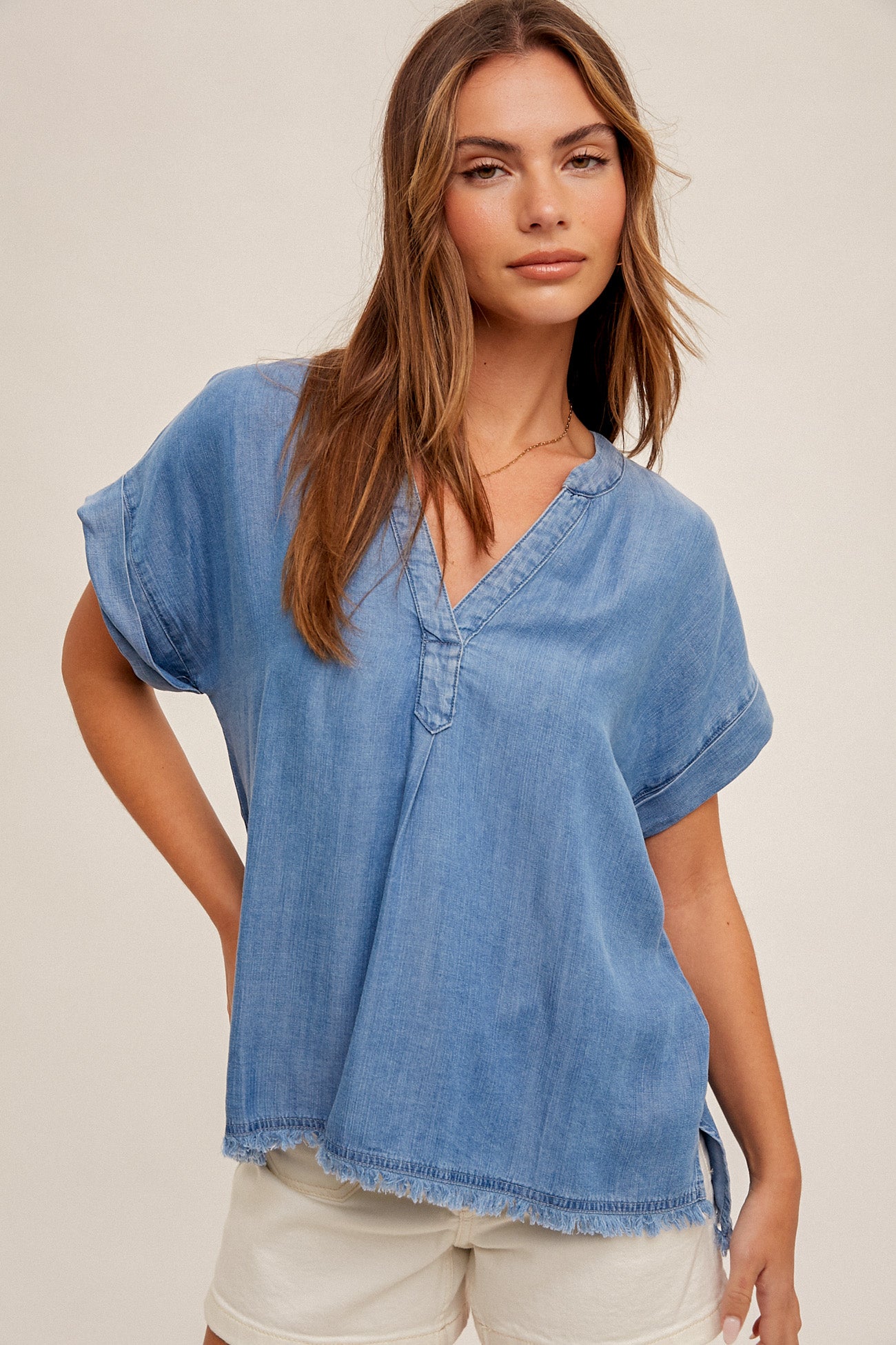 For a flirty and carefree look, try out our Riley Fringed Hem Chambray Top in Denim! The playful v-neck and angled cuff sleeves give this loose-fitting top a fun twist, while the dolman style adds a touch of quirkiness.