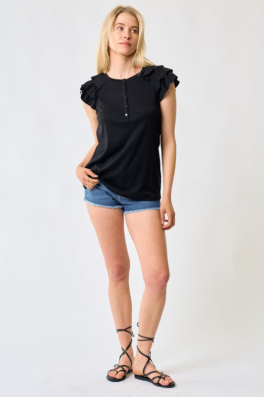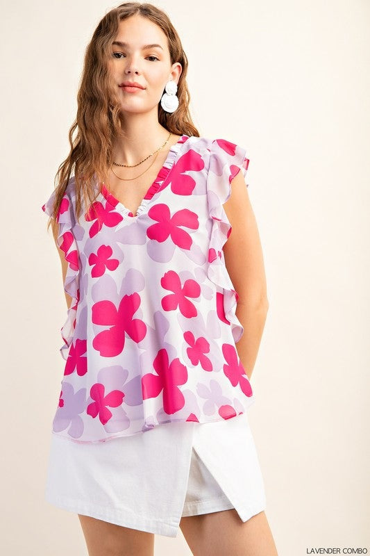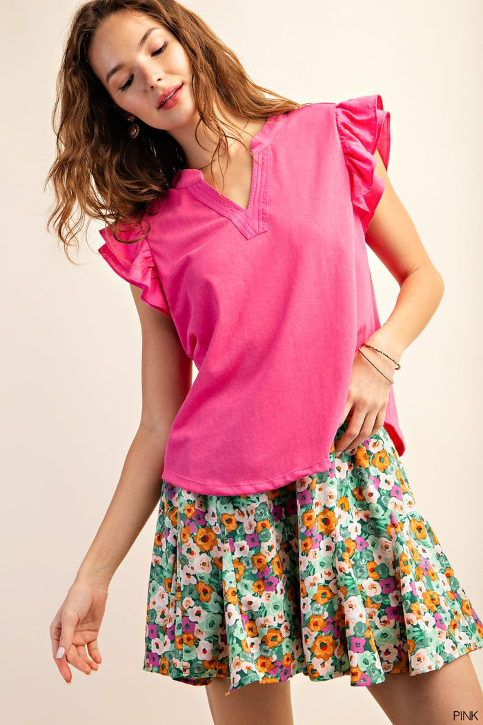 Perla V Neck Ruffle Short Sleeve Top in Pink