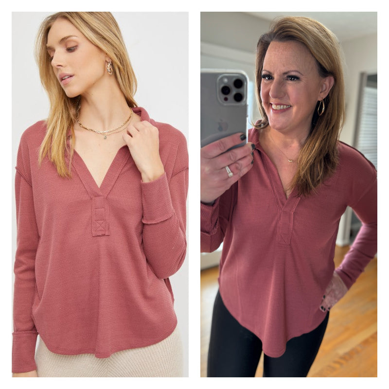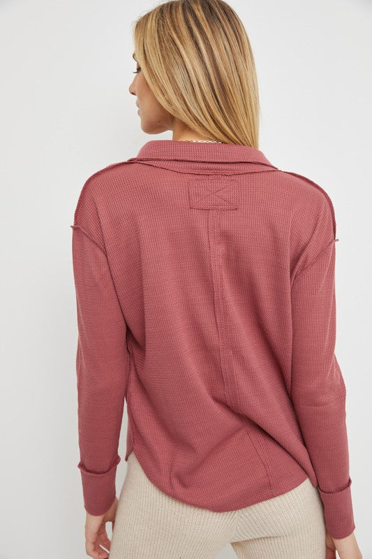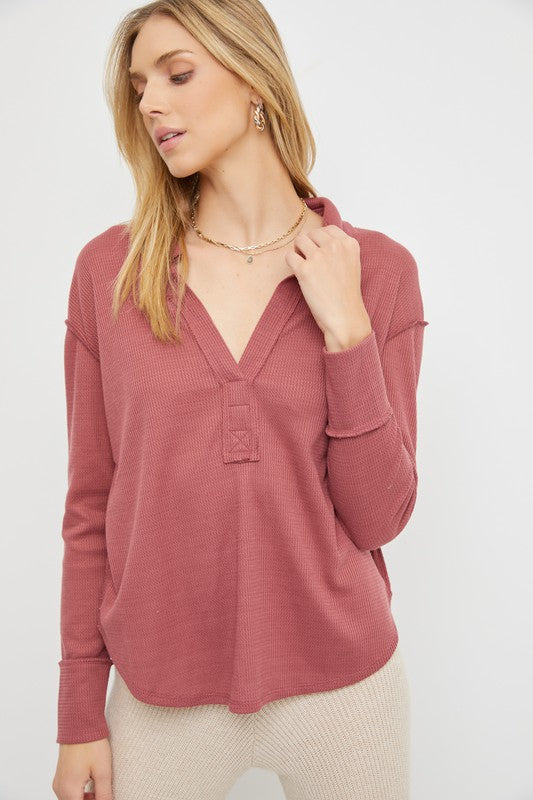 Stay cool (in more ways than one) in this lightweight, waffle knit top! Featuring a V-neckline, raw seam details, and a rounded hemline, Sue will keep you looking great all season long. Layer it up for extra style points!