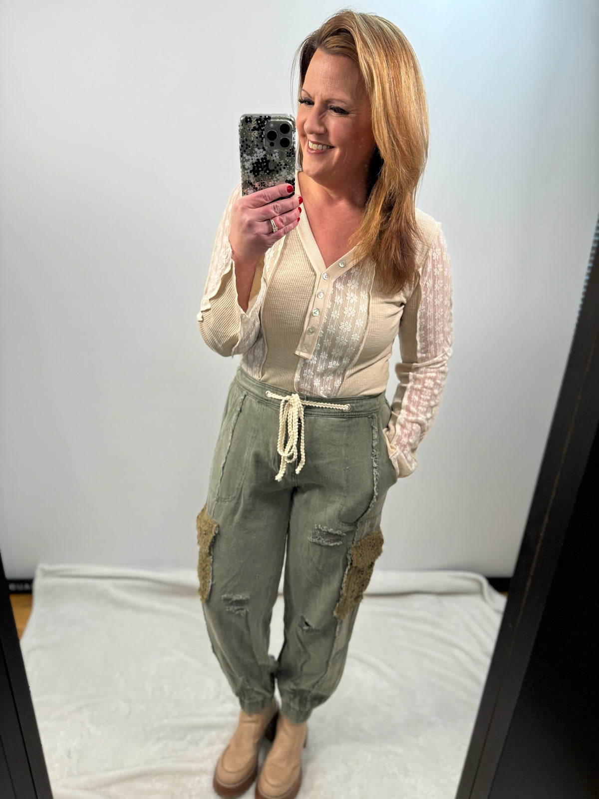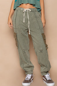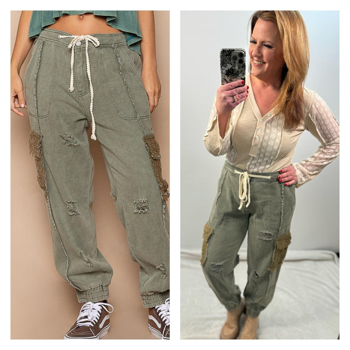 Get ready to jog in style with our Elliot Joggers in Olive! These denim pants feature a unique trim loop in the waistband and a side crochet lace pocket, adding a touch of personality to your look. With distressed detailing, you'll be making a statement wherever you go. (Comfortable and fashionable jogger denim pants with a twist!)