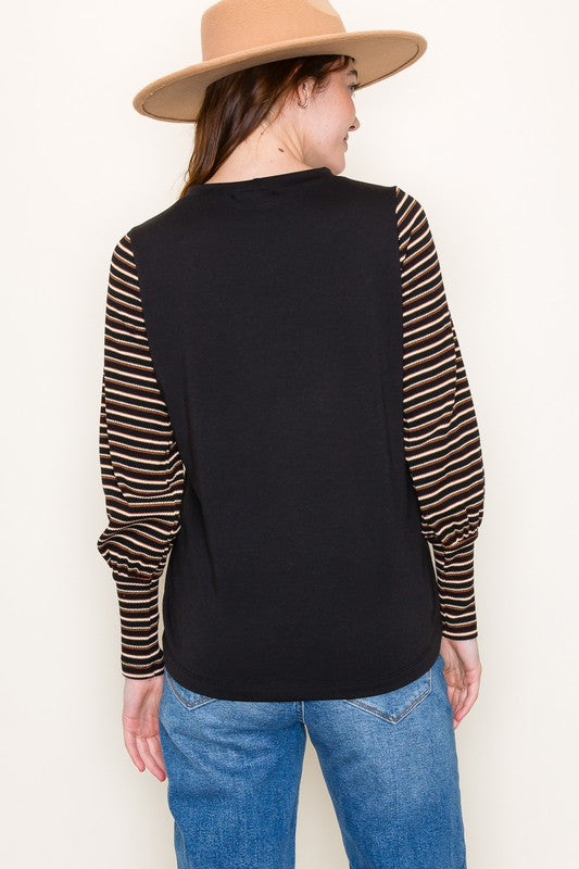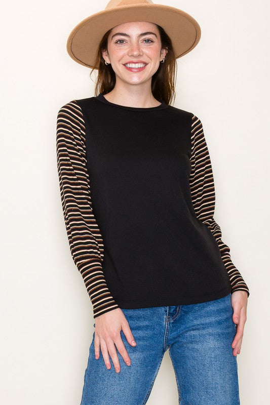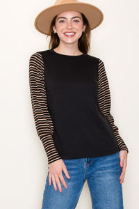 Saunter into the room in the vibrant Carrie! This fun and flirty crew neck top is sure to turn heads with its multi-color stripes, color-block terry fabric, and playful personality. Strike a sartorial chord in this knockout top!