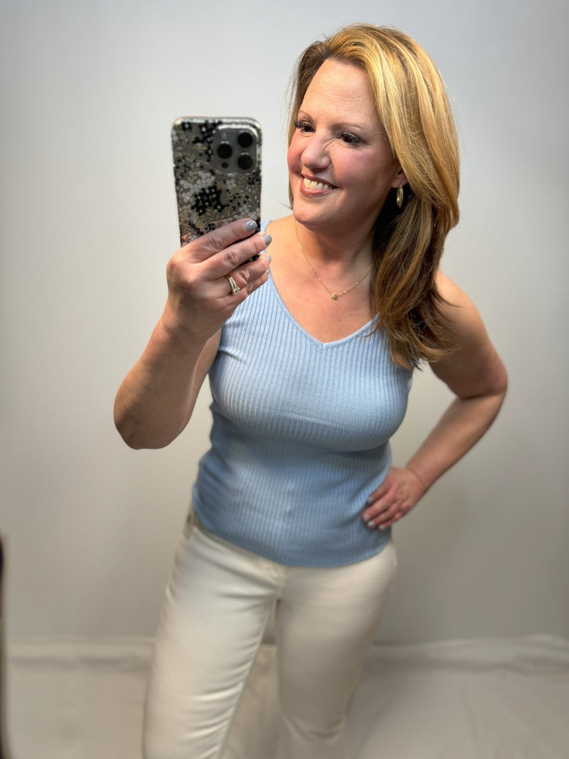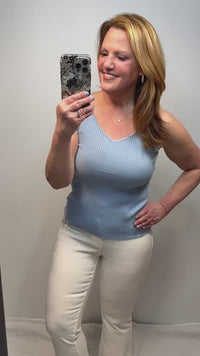 Julie is wearing the Ruthie Tank in Blue with the Kick Flare Magic Pants in Vanilla Cream