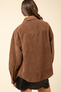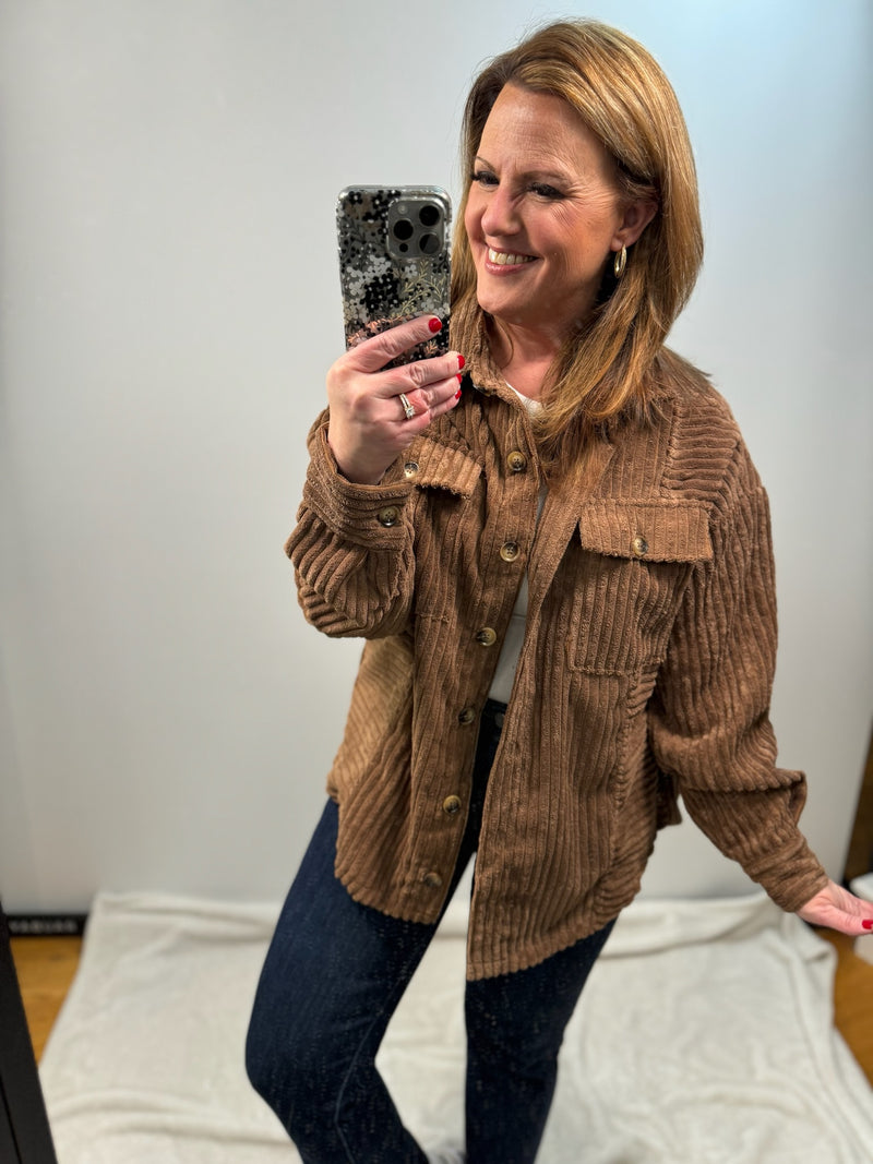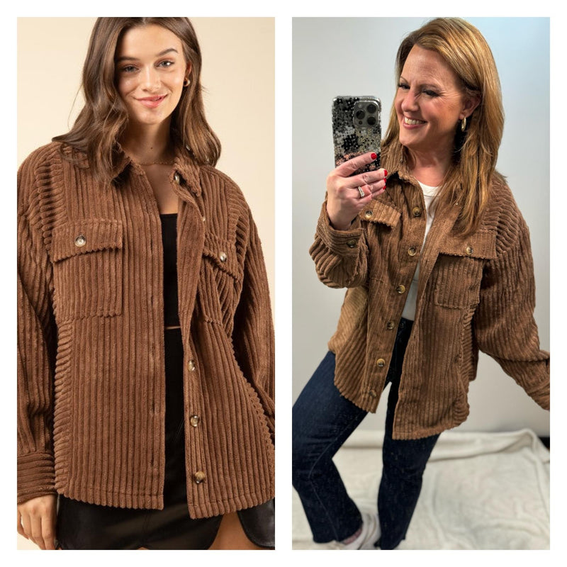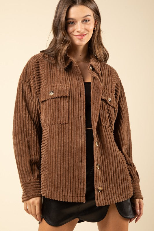 Meet the Brayden Shacket by VeryJ! This oversized, wide corduroy shirt that's ready to take on your biggest adventures. With its drop shoulder, button up design, and patch pockets, you'll be ready to tackle whatever comes your way. Experience the challenge and thrill of something new with Brayden